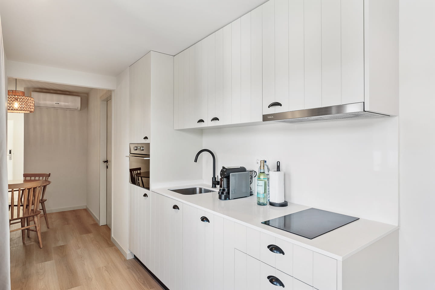 O coração do apartamento é a sua zona comum em open space, que inclui uma cozinha compacta e totalmente equipada, e uma área de estar com um confortável sofá-cama que acomoda duas pessoas extra.